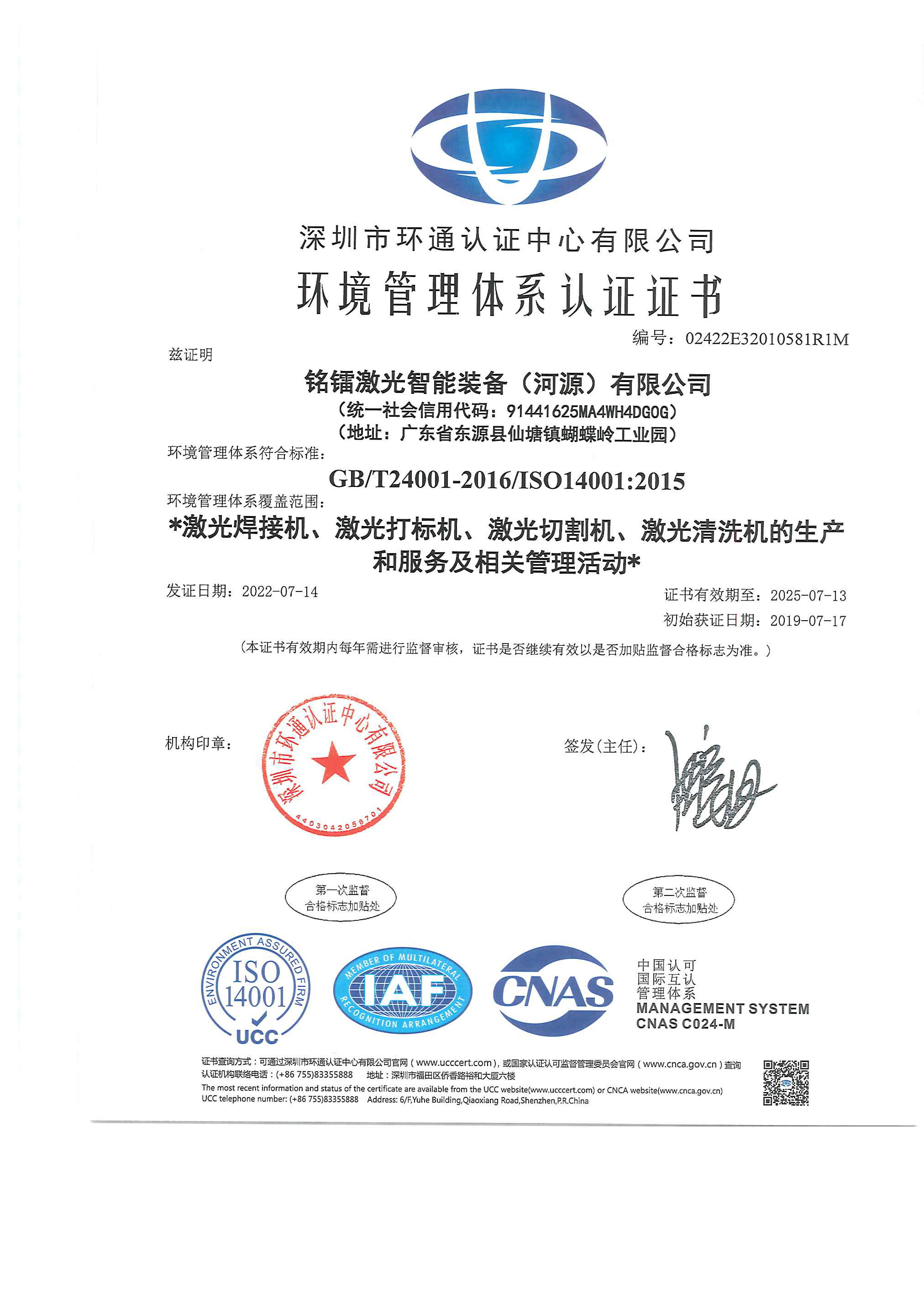环境管理体系认证证书