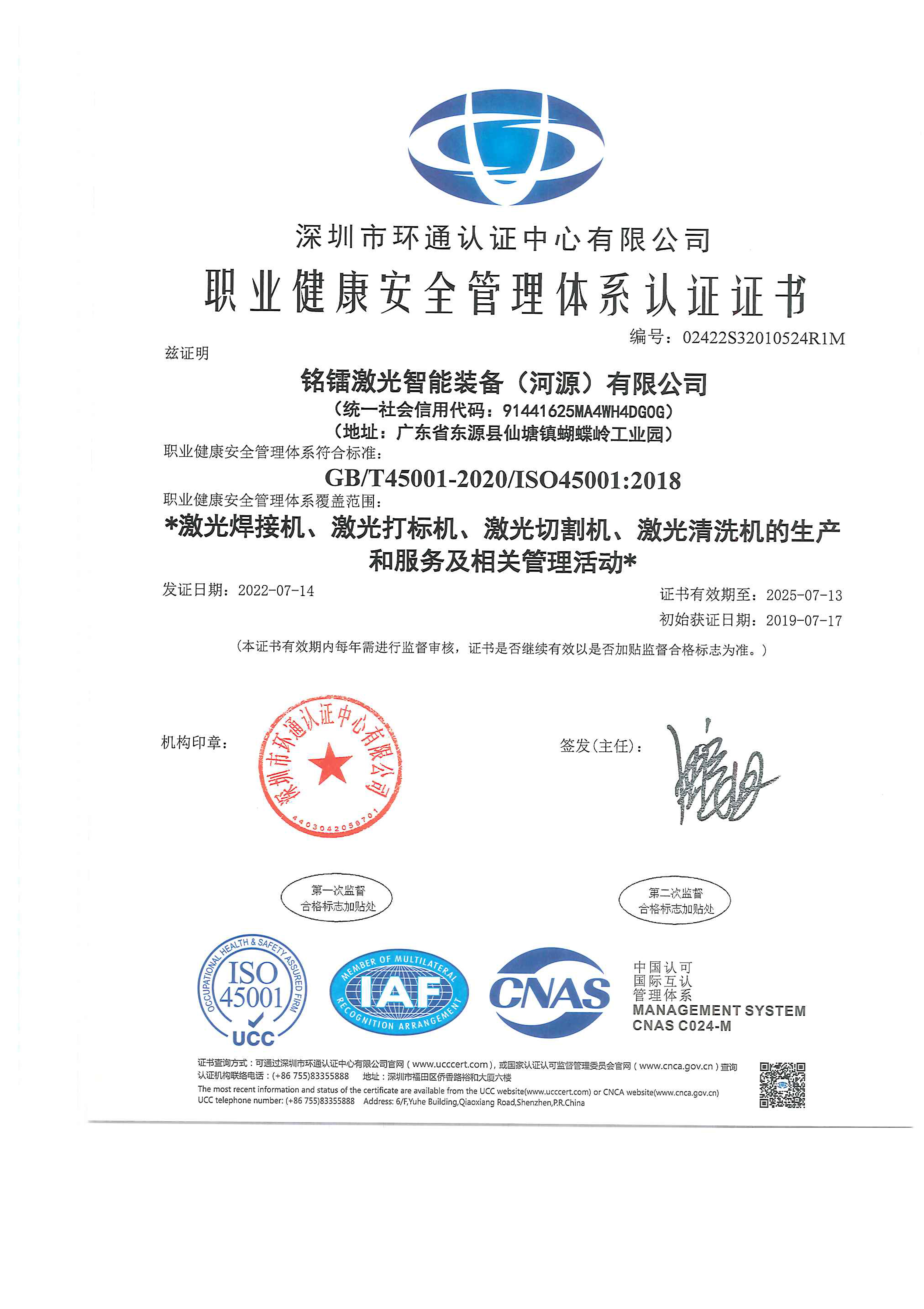 职业健康安全管理体系认证证书