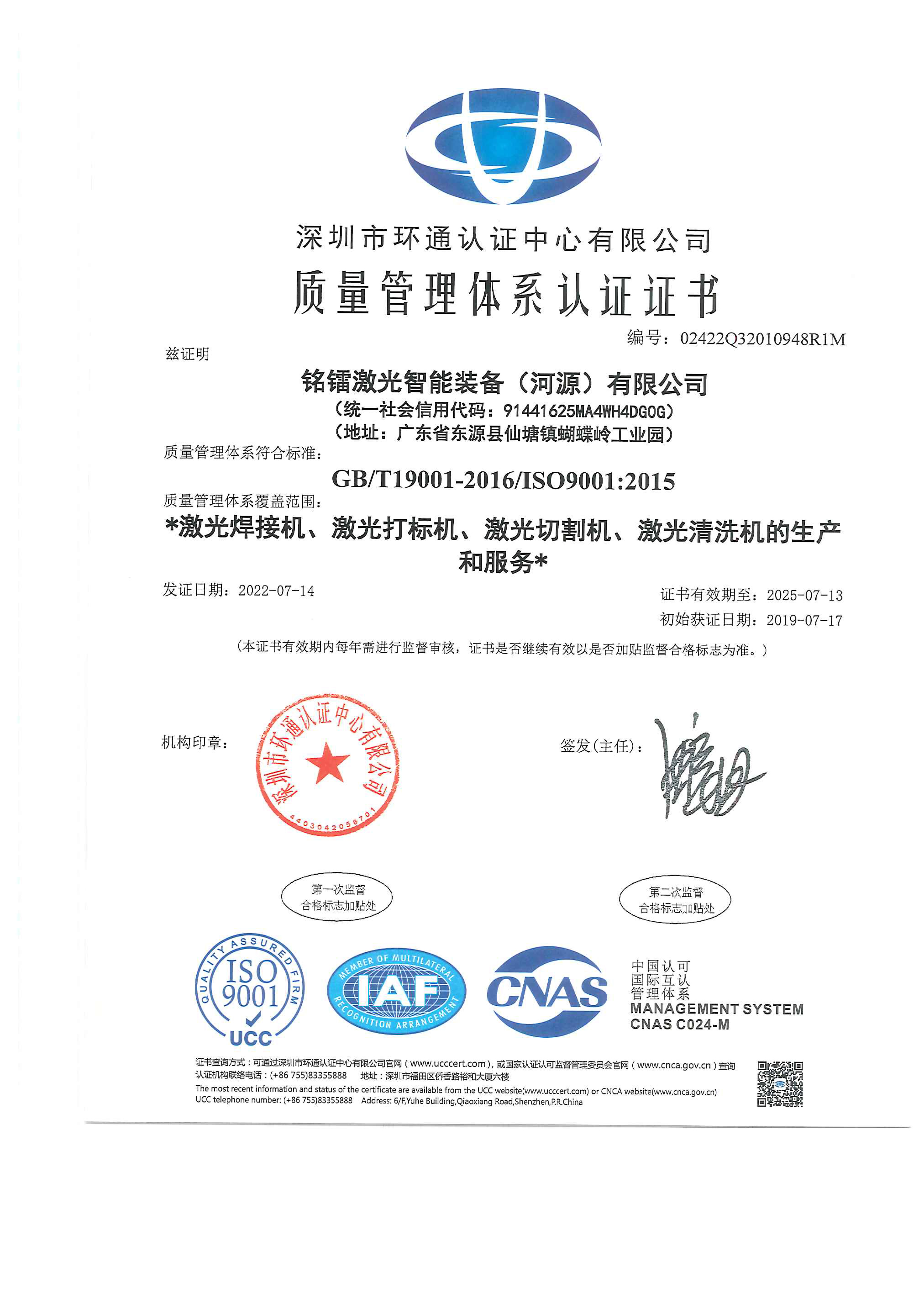 质量管理体系认证证书